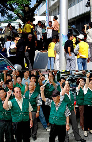 방폐장 유치를 반대하는 부안지역 사회단체 인사들이 15일 부안군의회앞에서 집회를 준비하고 있는 가운데(위) 같은시간 부안 국추련 인사들이 방폐장 유치를 결의하는 집회를 갖고 있다. (desk@jjan.kr)