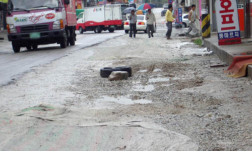 더욱이 '물의 거리조성공사'(구 보건소-농협주유소 약 300m)지역으로 알려진 구간에는 하수관거공사로 인해 도로가 웅덩이처럼 움푹 패이거나 양방향을 구분할 수 없을 정도로 노면정리가 안되고 있어 이곳을 운행하는 운전자들이 파손된 도로를 곡예 하듯 넘나들고 있는 등 차량의 파손까지 발생하고 있는 것으로 나타났다.