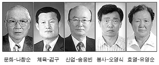 △체육장 김구(60·원광대 사범대체육학과 교수)=원광대 체육실장으로 일하며 원광대 야구부의 6연승을 이끌어낸데다 전국배드민턴대회 6연패를 거머쥐게 한 장본인이다. 또 김동문·하태권 선수와같은 올림픽 금메달 리스트를 배출하며 체육발전에 쏱아온 공로가 높다.