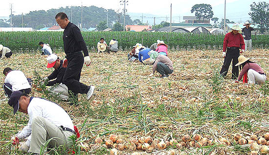이들은 13일 한미 FTA협상체결 및 고령화 등으로 날로 어려워져가는 농촌의 현실을 직시하고 부족한 농촌일손을 돕기 위해 양파수확이 한창인 상서면 감교리 양파수확현장을 찾아 2000여평의 양파캐기 등 일손을 도와 칭송을 받고 있다.
