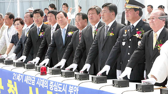 2일 부안군청옆 광장에서 열린 군 신청사 기공식에서 참석자들이 점화 스위치를 누르고 있다.../이강민기자 (desk@jjan.kr)