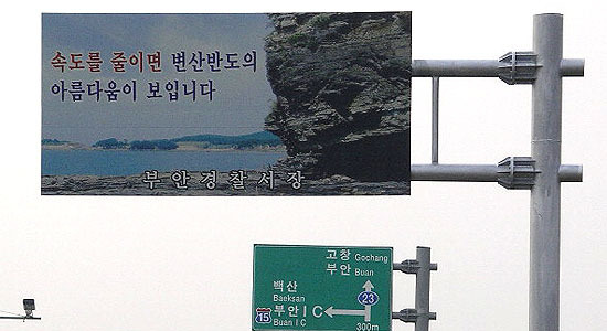 부안진입로인 국도23호선 동진강대교 일원에 가로4.4m,세로2,2m 크기로 설치된 이 표지판에는 빼어난 자연경관을 자랑하는 격포 채석강의 사진과 함께 ‘속도를 줄이면 변산반도의 아름다움이 보입니다’라는 문구가 들어 있어 운전자들에 시선을 사로잡고 있다.