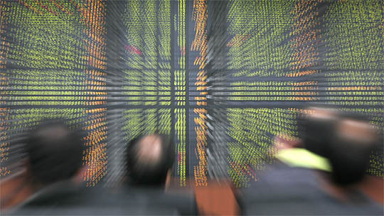 코수피 지수가 장중 한 때 1.100선이 붕괴됐던 22일 전주의 한 증권사에서 투자자들이 온통 초록색으로 물들어 있는 시황판을 보고 있다. 최선범(desk@jjan.kr)