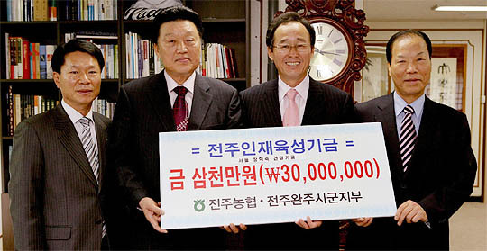 농협 전주완주시군지부(지부장 김종엽)와 전주농협(조합장 김기곤)은 29일 전주시청 시장실에서 인재육성재단이사장 등 관계자들이 참석한 가운데 전주지역 인재육성을 위한 '장학숙 건립기금' 3000만원 전달식을 가졌다.