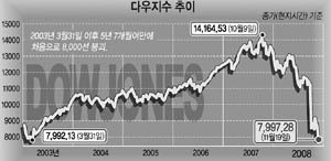 이날 뉴욕증권거래소(NYSE)에서 다우존스 산업평균지수는 전날보다 427.47포인트(5.07%) 내린 7,997.28에 거래를 마쳤다. 다우지수는 이달과 10월에도 장중에 8,000선이 무너진 적은 있지만 종가로 밑돈 것은 2003년 3월31일 이후 5년 7개월여만에 처음이다.