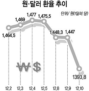 10일 서울 외환시장에서 달러화에 대한 원화 환율은 전날보다 달러당 53.20원 폭락한 1,393.80원으로 거래를 마쳤다. 환율이 1,400원 아래로 떨어진 것은 지난달 14일 이후 한 달여 만에 처음이다.