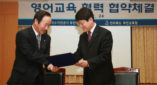 부안교육청(교육장 송경식)과 한국수자원공사 부안댐관리단(단장 고양수)은 지난 24일 부안댐 주변지역 학교의 영어교육을 위한 원어민 지원에 연간 5000만원을 지원하기로 협력 협약을 체결했다.