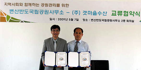 국립공원관리공단 변산반도 국립공원사무소(소장 김용무)와 부안 특산품 생산업체인 <주> 갯마을(대표 박명언)은 교류협약을 최근 체결하고 상호협력을 다짐했다. 주>