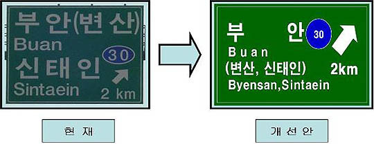 그러나 서해안고속도로에서 부안읍내 및 새만금·변산반도 지역 등으로 연결되는 부안나들목 부근에 설치된 표지판은 이와 다르다.