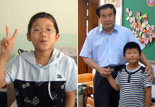 변산면민의 도움으로 두차례 뇌수술후 위독상태를 넘긴 현다운 어린이(왼쪽), 등교하고 있는 김산학생과 김용주 교감선생님(오른쪽). (desk@jjan.kr)
