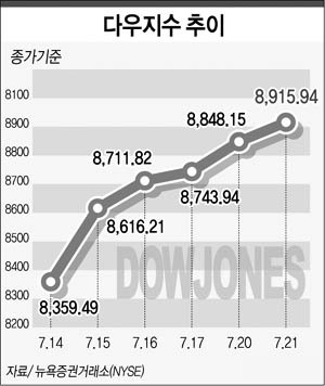 21일(현지시간) 미국 뉴욕증시에서는 주요 기업들의 2.4분기 실적이 예상을 웃도는 수준을 기록하면서 다우지수가 7일째 올라 8,900선을 넘어서는 등 주가가 상승세를 이어갔다.