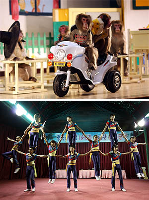 부안 원숭이학교의 원숭이 공연(위)과 중국 기예단의 공연(아래). (desk@jjan.kr)