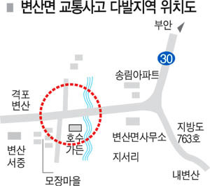 10년간 6명 사망 부안 변산 모장마을앞 국도서 '천도제'…2차선에 과속 일쑤 '위험'
