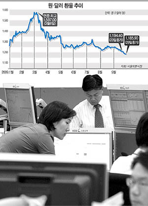 원·달러 환율이 1년여 만에 1180원대로 하락했다. 전문가들은 올 연말 환율이 1150원대까지 떨어질 것이라는 전망을 내놓고 있다. 내년까지 환율 하락세가 지속될 것이라는 전망도 나온다. 원화가치가 강세를 보이는 것은 외국에서 우리 경제를 그만큼 안정적으로 보고 있기 때문으로 보인다. 이런 관점에서는 환율 하락세를 매우 긍정적으로 받아들일 수 있지만, 수출업체들은 가격 경쟁력 약화로 인한 채산성 악화를 우려하고 있다. 특히 상반기 우리 경제가 바닥을 탈출하는데 고환율 덕을 톡톡히 봤다는 점에서 환율 하락은 경기회복에도 적지 않은 영향을 미칠 것으로 예상된다.