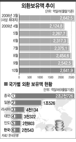 3일 한국은행에 따르면 10월 말 외환보유액은 2천641억9천만 달러로 9월 말보다99억4천만 달러 증가했다.