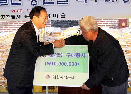 대한지적공사(사장 이성열)는 지난 20일 순창군 순창읍 금과면 동전리 대장마을 회관에서 '1사1촌 자매결연 마을 농산물 팔아주기 행사'를 갖고 쌀 1000만원어치를 구매했다고 밝혔다.