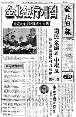 전북은행이 1969년 12월10일 수권자본금 3억원, 납입자본금 2억원으로 창립 개점한 후 40년이 흘렀다. 당시 전북은행 예금 1호는 박정희 대통령이었다. 박 대통령은 개점 첫날 정기예금 1호 통장의 주인이 됐고, 10만원을 예금했다. 향토적금통장 1호는 지역 상공계의 거두 고판남씨였다. 그는 2년짜리 향토적금통장을 개설했으며, 계약고는 5000만원이었다. 이렇게 들어온 첫날 예수금은 4억7000만원에 달했다. 창립 100여일인 1970년 3월말 현재 총예금은 10억300만원에 달했고, 총대출금은 5억7400만원을 기록했다.