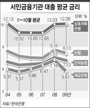 그러나 1∼10월 상호저축은행의 평균 대출금리는 12.08%로 작년 같은 기간의 12.03%보다 오히려 올라 2004년(12.13%) 이후 최고의 수준을 나타냈다.