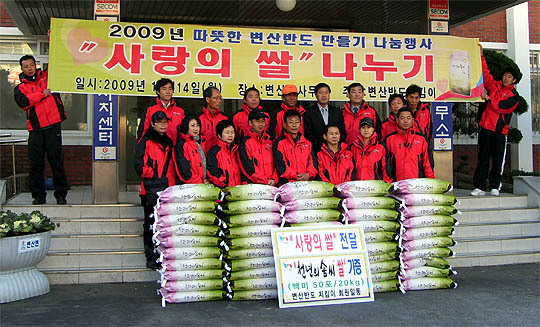 변산반도 지킴이(회장 김형복)는 연말연시를 맞아 관내 경로당 및 어려운 이웃에게 써달라며 사랑의 쌀 20kg 50포대( 시가 230만원 상당)를 변산면사무소(면장 정흥귀)에 14일 기탁했다.