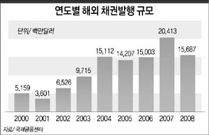 우리나라의 해외 채권발행이 급증한 것은 2008년 글로벌 금융위기로 미뤄졌던 발행물량이 한꺼번에 몰린 데다 한국 경제에 대한 대외 신인도가 높아져 발행 비용이 줄어들었기 때문으로 풀이된다.