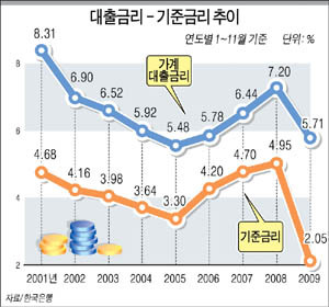 1∼11월 기준 연도별 가계-중소기업 대출금리는 △2004년 0.08% 포인트 △2005년 0.27%포인트 △2006년 0.39%포인트 △2007년 0.23%포인트 △2008년 0.15%포인트 등이었다.