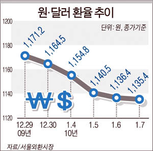 원·달러 환율은 지난해 30일부터 이날까지 7거래일 연속 하락세를 이어가고 있다. 새해 들어서 지난 주말까지 엿새 동안 34원이나 떨어졌다.