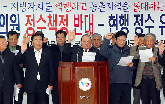 부안지역 사회단체장들로 구성된 전북 시군의원 정수책정 부안군 반대대책위원회(위원장 이덕룡 부안군애향운동본부장 겸 사회단체협의회장)는 최근 기자회견을 열어 " 지방자치에 역행하고 농촌지역을 홀대하는 시군의원 정수책정안을 반대한다"는 성명서를 발표했다.