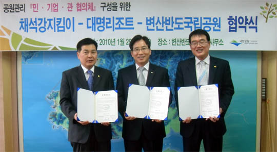 변산반도국립공원사무소(소장 박용규)는 채석강지킴이(지역민간단체)·대명리조트(기업)와 공원관리'민·기업·관 협의체'를 구성하고 교류협약식을 지난달 29일 체결했다고 밝혔다.