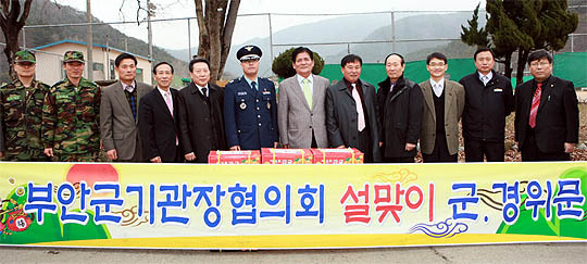 부안군 기관장협의회(회장 김호수 부안군수 )는 설 명절을 앞두고 지난 9일 육군 제8098부대105연대 1대대와 공군 8351부대를 방문, 위문품을 전달하고 지역방위 노고를 위로했다.
