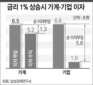 삼성경제연구소는 금리가 1%포인트 상승하면 가계와 기업의 연간 이자부담이 6조9천억원 늘어날 것으로 예상했다.