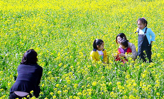 부안군 동진면과 행안면 일대에 펼쳐진 유채꽃밭에서 가족 단위 관광객이 사진 촬영을 하고 있다. (desk@jjan.kr)