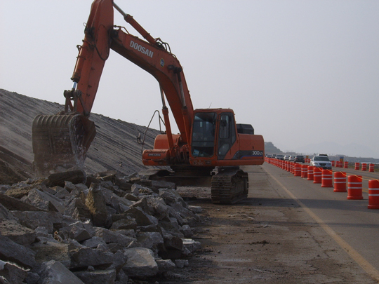 "새만금 1호 방조제 높임공사 현장 부근 도로를 통행하기 불안해요."