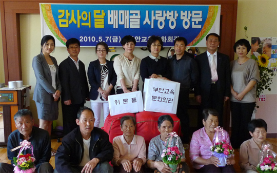 부안교육문화회관(관장 이선옥)은 가정의 달을 맞아 최근 부안군 주산면에 위치한 배매골 사랑방을 방문, 꽃꽂이 작품과 이불 10채와 부식 등 위문품을 전달했다.