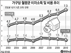 이는 5년 전인 2005년 1분기(4만7천원)보다 55.3% 증가한 것이다. 같은 기간 가구당 소득이 286만3천원에서 372만9천원으로 28.2% 증가했음을 고려할 때 소득과 비교하면 이자비용이 배에 가까운 증가율로 늘어났음을 의미한다.
