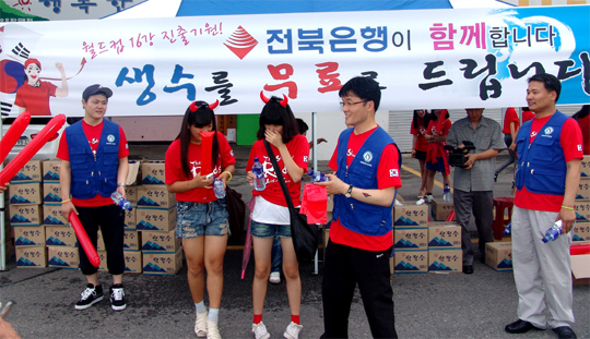 전북은행은 이날 그리스전을 맞아 전주 종합경기장, 군산 수성체육공원, 익산 중앙체육공원 등에 부스를 설치, 응원용 막대풍선과 생수를 무료로 지원하며 지역민들의 응원열기를 북돋웠다.