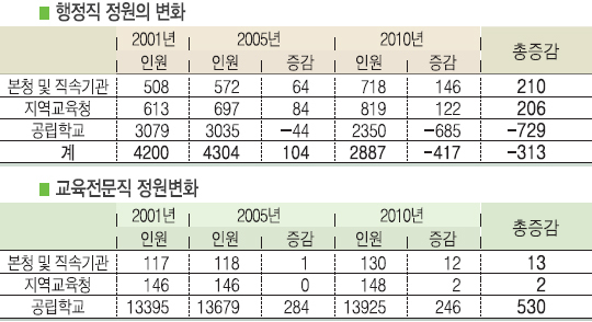 같은 기간동안 교육전문직 공무원의 정원변동이 거의 없었다는 점도 행정공무원의 정원관리에 무리가 있었음을 보여주고 있다. 교육청과 직속기관에 근무하는 교육전문직의 경우 2001년 263명에서 2005년 264명, 2010년 278명으로 10년동안 15명 증가하는데 그쳤다. 오히려 일선학교의 교사는 1만3395명에서 1만3925명으로 530명 증가했다.