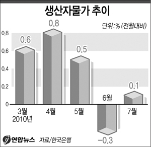 한국은행은 7월 생산자물가 지수가 지난해 같은 달보다 3.4% 오른 것으로 집계됐다고 9일 밝혔다. 6월과 비교하면 0.1% 올랐다.