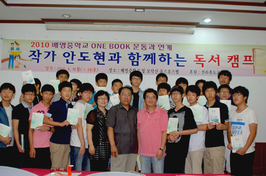 '원북(One Book)운동'을 펼치고 있는 정읍 배영중학교(교장 장성기)가 여름방학을 맞아 13일과 14일 김제 모악산 유스호스텔에서 「연어」의 작가 안도현 시인(우석대 교수)과 만나는 독서캠프를 진행했다.