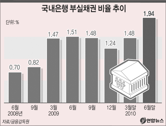 부실채권비율은 2008년 6월말 0.70%였으나 글로벌 금융위기가 터진 9월말 0.82%로 상승한 후 2009년 6월말에는 1.51%까지 올랐다.