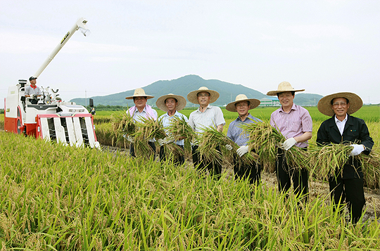 올들어 부안지역 첫 벼베기가 24일 계화면 창북리 김상식씨(53)논에서 김호수 군수·홍춘기 군의회의장·양영찬 계화농협조합장 등이 참석한 가운데 이뤄졌다.