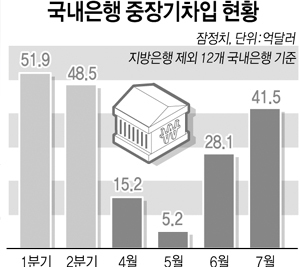 금융감독원은 7월에 12개 국내 은행의 만기 1년 초과 중장기 차입액이 41억5천만달러로 전월(28억1천만달러)보다 47.7% 증가한 것으로 잠정 집계됐다고 24일 밝혔다. 이는 작년 1월 47억1천만달러 이후 가장 많은 수준이다.