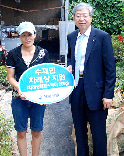 은행 관계자는 "주택 침수 피해를 입은 도내 13개 시군 116세대에 20만원 상당의 추석 차례상 일체를 지원한다"며 "뜻밖의 재난으로 인해 실의에 빠진 수재민들이 여느 때와 같이 고유의 명절인 추석을 따뜻하게 보낼 수 있도록 하기 위해 내린 결정"이라고 말했다.