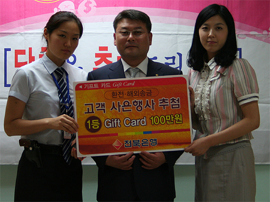 전북은행(은행장 김한)은 지난 6월 1일부터 8월말까지 실시한 환전·송금 고객을 위한 사은행사 경품 추첨에서 당첨된 228명에게 소정의 선물 카드와 문화상품권을 지급하고 있다.