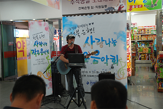 선물꾸러미를 한아름씩 안고 바쁘게 걸음을 옮기던 귀성객들이 작은 음악회 주위에 모여들었고, 잠시나마 색소폰과 통기타 연주 속으로 빠져들었다.
