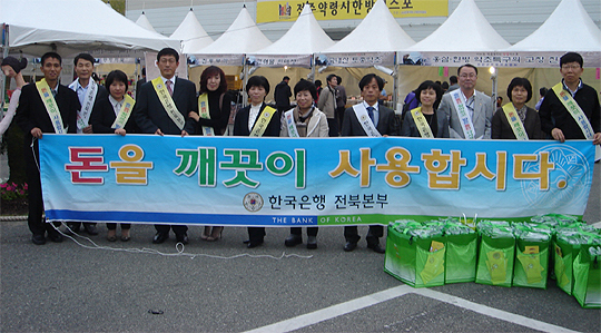 한국은행 전북본부(본부장 박정룡)는 지난 21일 전주한옥마을에서 '2010한국음식관광축제'와 '2010전주비빔밥축제' 관람객 등을 대상으로 돈 깨끗이 쓰기 및 동전 다시 쓰기 캠페인을 열었다.