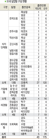 현재 도내에서 운영중인 실업팀은 13개 자치단체에서 22개 종목을 육성하고 있고, 4개 기업체에서 4개 종목, 도 체육회에서 5개 종목을 육성하고 있다.
