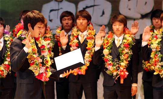 축사에 이어 선수와 코칭 스텝들은 내빈들의 축하를 받으며 무대에 올랐고, 이승기 선수가 대표로 선수 선서를 하며 필승을 다짐했다.