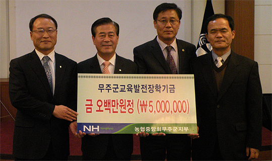 농협무주군지부(지부장 이재덕)는 21일 무주군의 교육발전에 이바지하기 위한 500만원의 장학기금을 전달하였다.