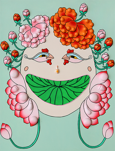 내가 이 작품을 만들 때만 해도 머리가 이곳 저곳 뻗치는 파마 머리였다. 머리에 피어나는 모란은 민화에서 부귀영화를 상징한다. 모란을 통해 즐겁고 행복하게 살기를 바라는 마음을 담았다. 작품 속 눈웃음을 짓고 있는 나의 눈은 봉황꿈에 착안해 만들어졌다. 꿈 속에서 나는 커다란 나무 아래에서 엄마를 그리워하며 울고 있었는데, 봉황 한 쌍이 내 머리 위로 날아가는 것을 보았다. 생시 같았다. 아마도 그 봉황이 엄마일 것이라는 생각이 들었다. 봉황은 상서로움을 상징하는 상상의 새이기도 해 넣게 됐다.