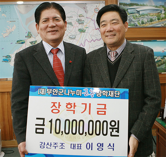 부안에서 뽕주를 생산하고 있는 강산명주 이영식 회장은 21일 김호수 부안군수에게 나누미 장학재단기금으로 써달라며 1000만원을 기탁했다.